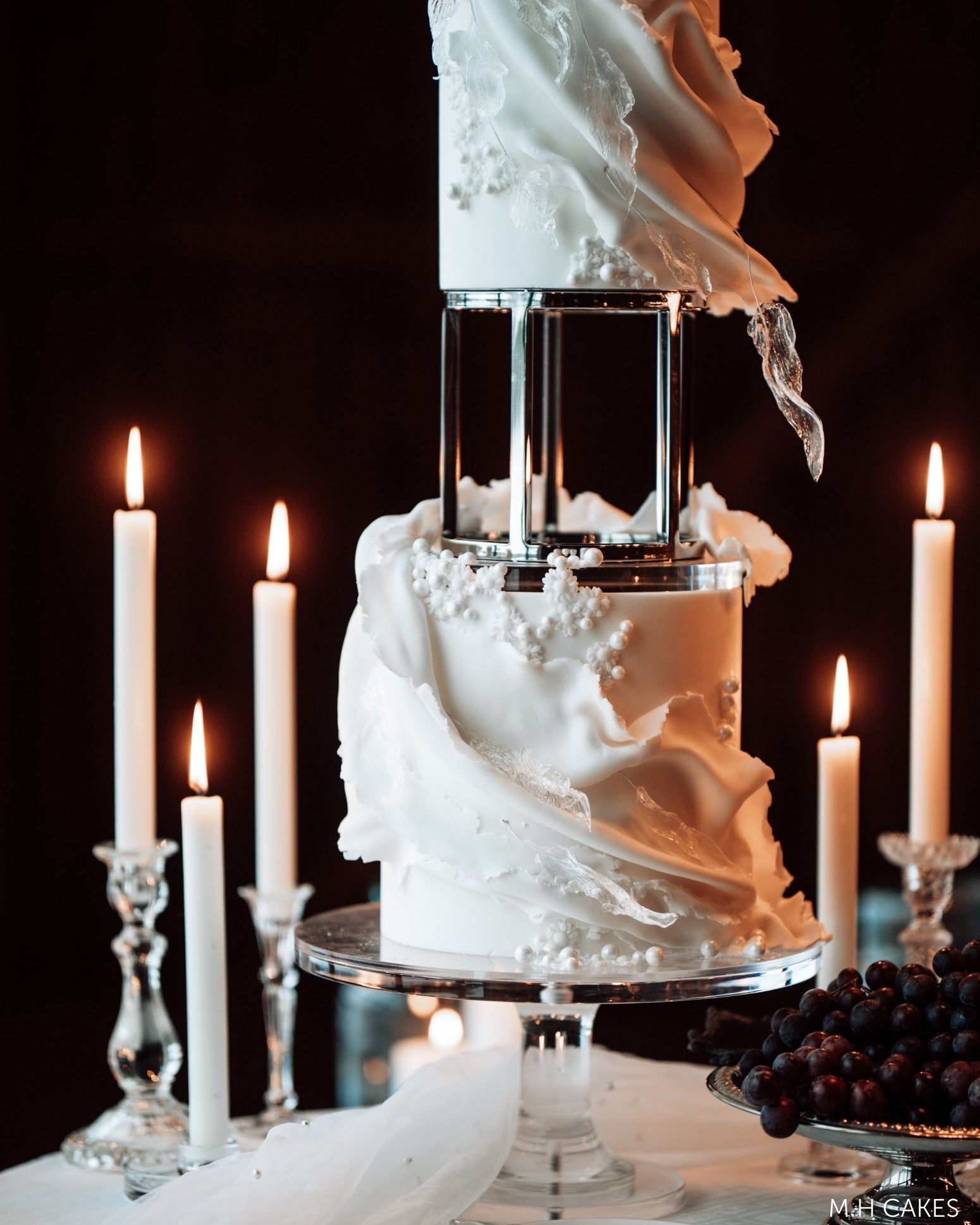 A crisp white cake elevated on a structured stand, with a silver separator detail, feels more like gallery display than dessert. This is modern luxury at its most controlled.