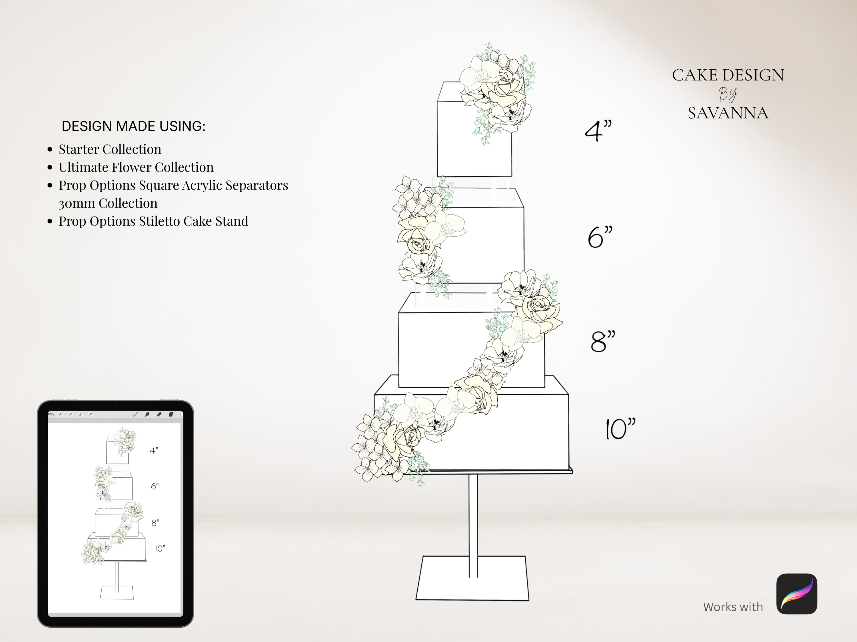 The perfect way to sketch your cake designs. Use these stamps with the Procreate App (available on iPhone and iPad) to design beautiful cakes for your customers.